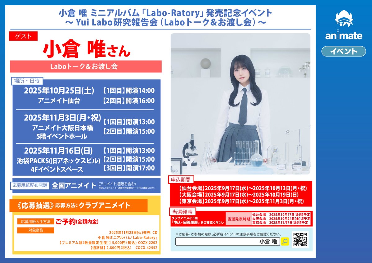 【イベント情報】 📢シリアル配布は11/3まで‼️‼️ 小倉 唯 ミニアルバム「Labo-Ratory」発売記念イベント ~Yui Labo研究報告会(Laboトーク&お渡し会)~ 期間中、対象商品に全額内金ご予約いただいたお客様にシリアル応募用紙をお渡しいたしますコォ✨✨ #小倉唯 さん 詳細は🔽POPをチェック