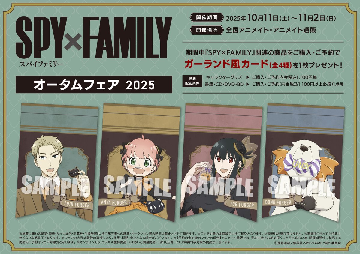 【フェア情報】 まもなく終了❗️ 『TVアニメ『SPY×FAMILY』オータムフェア 2025』好評開催中コォ🎉 期間中『SPY×FAMILY』関連のキャラクターグッズをご購入・ご予約内金税込1,100円毎に 【ガーランド風カード(全4種)】を1枚プレゼント🎁 🔽詳しくはコチラ🔽
