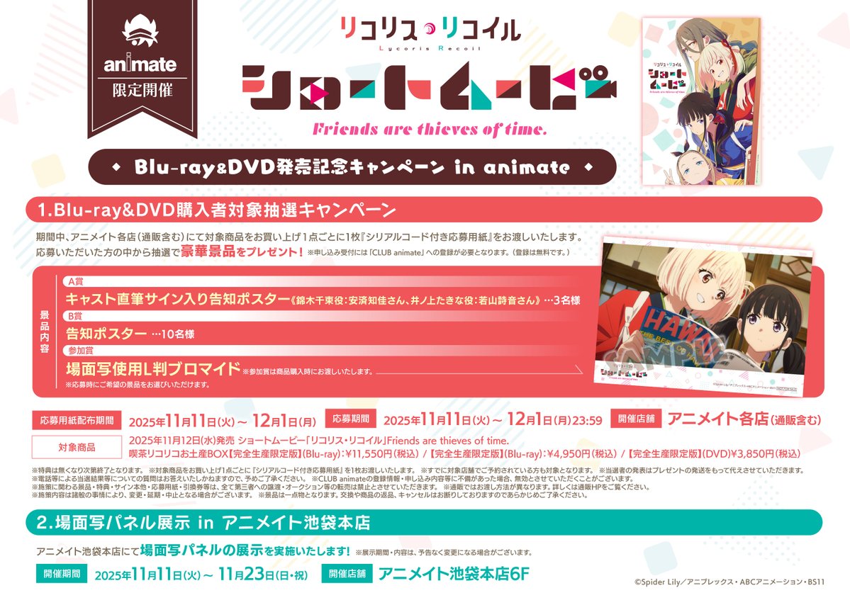 【フェア情報】 「ショートムービー「リコリス・リコイル」Friends are thieves of time.」Blu-ray&DVD発売記念キャンペーン in animate 11/11(火)より開催決定コォ‼️‼️ 郡山店は①Blu-ray&DVD購入者対象抽選キャンペーンが対象ですコォ✨✨ #リコリコ 詳細は🔽POPをチェック