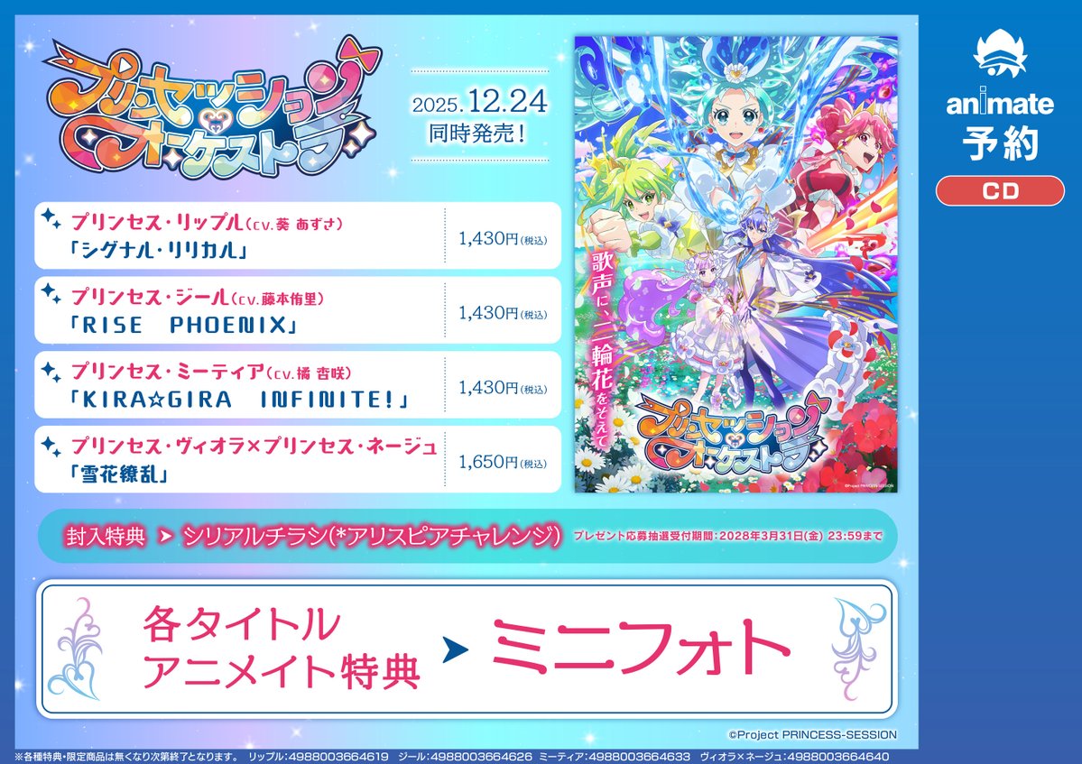 【CD予約情報】 📣12/24発売‼️‼️ プリンセッション・オーケストラ キャラクターソング 各タイトル予約受付中コォ🎵🎵 🎁各アニメイト特典:ミニフォト #プリオケ 🔽バーコード提示で簡単予約