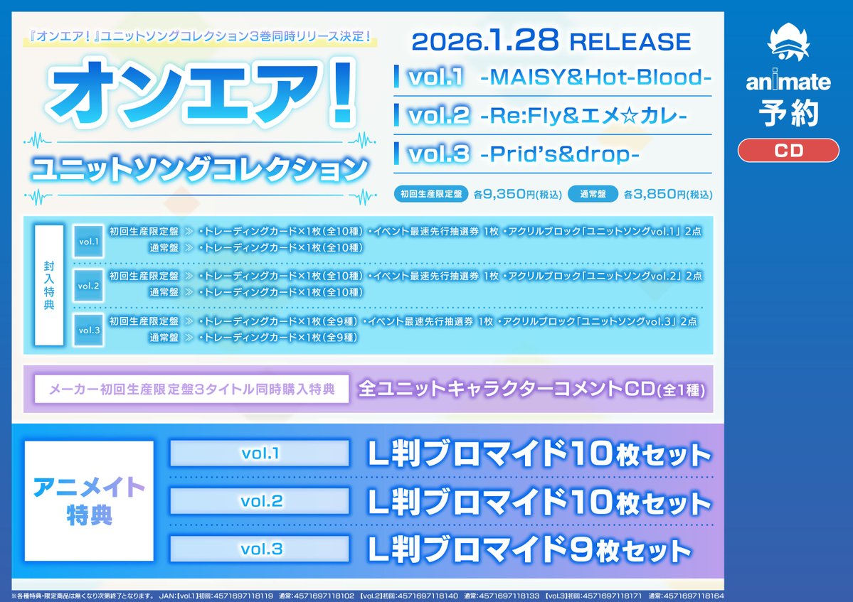 【CD予約情報】 『#オンエア!』ユニットソングコレクション vol.1~vol.3 各タイトル予約受付中コォ🎵🎵 🎁各アニメイト特典:L判ブロマイドセット 🎁メーカー3タイトル同時購入特典:全ユニットキャラクターコメントCD ※初回限定盤対象 🔽バーコード提示で簡単予約