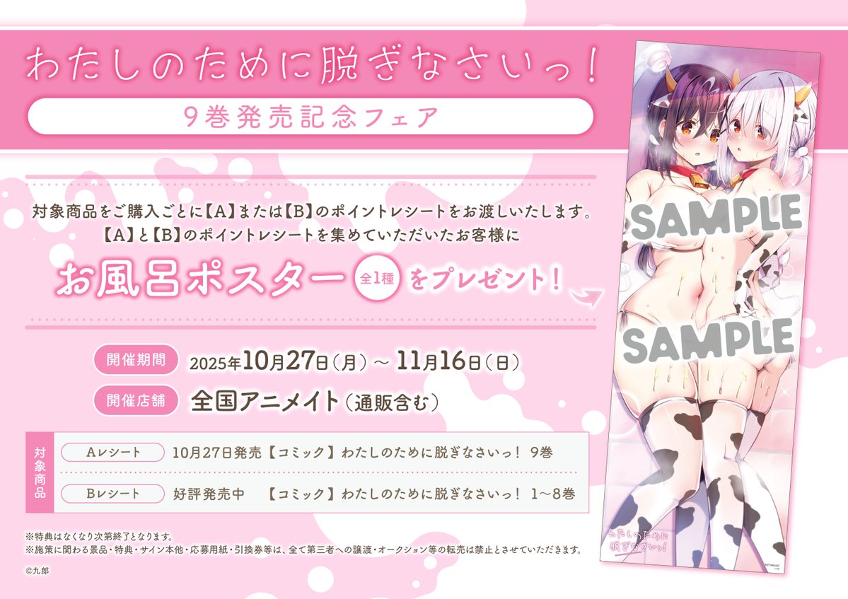 【書籍フェア情報】 10月27日より 『「わたしのために脱ぎなさいっ!」9巻発売記念フェア』 の開催が決定ですコォ💕 期間中、フェア条件を満たしたお客様に【お風呂ポスター(全1種)】を1枚プレゼント🎁 #わたぬぎ 🔽詳細は下記の画像をチェック🔽