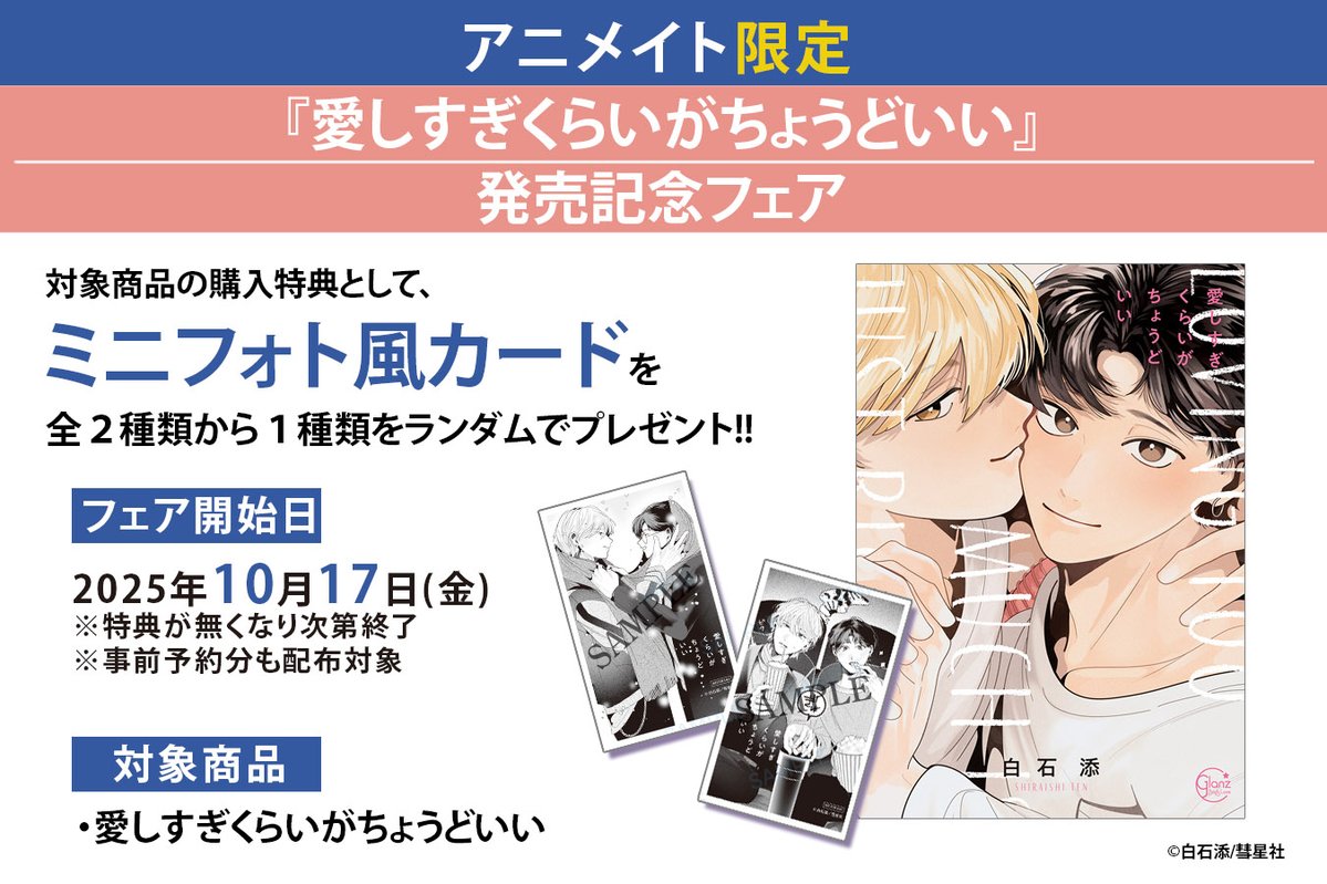 【書籍フェア情報】 現在、 「『愛しすぎくらいがちょうどいい』発売記念フェア」 が開催中ですコォ☀️ 期間中、対象商品1冊ご購入毎に【ミニフォト風カード(全2種)】を1枚プレゼント🎁 🔽詳細は下記の画像をチェック🔽