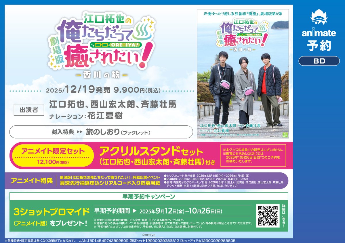 【BD予約情報】 『劇場版 江口拓也の俺たちだって癒されたい!~香川の旅~』 予約受付中コォ✨✨ 📢早期予約キャンペーンは10/26(日)まで‼️‼️ 🎁早期予約特典:3ショットブロマイド(アニメイト版) #俺癒 🔽バーコード提示で簡単予約