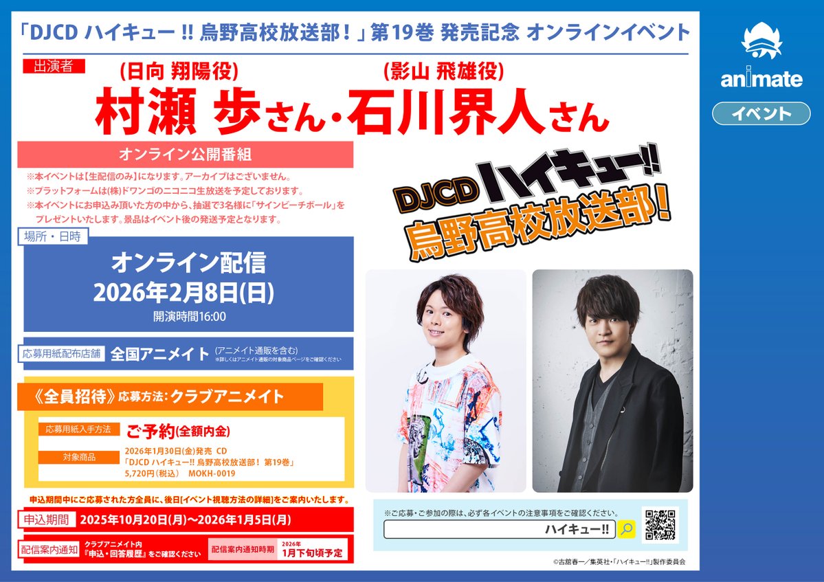 【CD予約情報】 DJCD ハイキュー!! 烏野高校放送部! 第19巻 予約受付中コォ🐦⬛📻 1/5までに全額内金ご予約いただいたお客様にオンラインイベントの応募シリアルをお渡しいたしますコォ✨✨ #ハイキュー 🔽バーコード提示で簡単予約