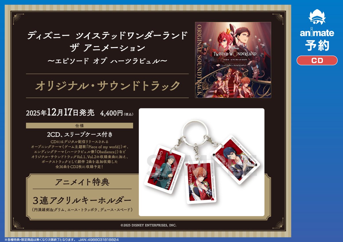【CD予約情報】 ディズニー ツイステッドワンダーランド ザ アニメーション ~エピソード オブ ハーツラビュル~オリジナル・サウンドトラック 予約受付中コォ🎵🎵 🎁アニメイト特典:3連アクリルキーホルダー #ツイステ #ツイステアニメ 🔽バーコード提示で簡単予約