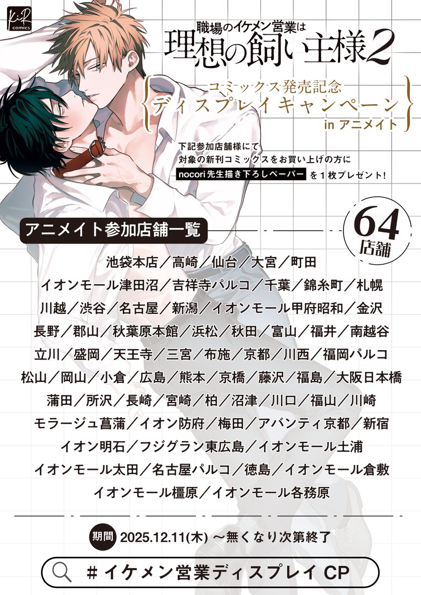 【書籍フェア情報】 12月11日より‼️ nocori 先生「職場のイケメン営業は理想の飼い主様 2 」のディスプレイキャンペーン開催が決定コォ🎉 対象書籍1冊ご購入で ≪nocori先生描き下ろしペーパー≫を1枚プレゼント🎁 🔽詳しくはコチラ🔽