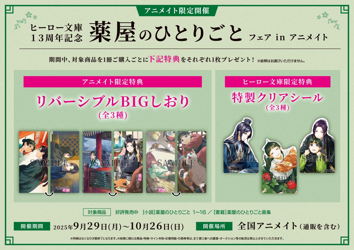 【フェア情報】 ‼フェアは10月26日まで‼ ヒーロー文庫13周年記念「薬屋のひとりごと」フェア in アニメイト まもなく終了ですコォ❣️ 期間中、フェア条件を満たしたお客様に、特典≪リバーシブルBIGしおり(全3種)≫&《特製クリアシール(全3種)》を1枚プレゼント🎁✨ 🔻詳細はこちら🔻