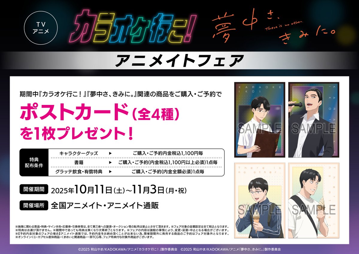 【フェア情報】 TVアニメ『カラオケ行こ!』『夢中さ、きみに。』アニメイトフェア 本日≪11日~≫開催ですコォ🎉 期間中、フェア条件を満たしたお客様に、≪ポストカード(全4種)≫を1枚プレゼント🎁✨ #カラオケ行こ 🔻詳細はこちら🔻