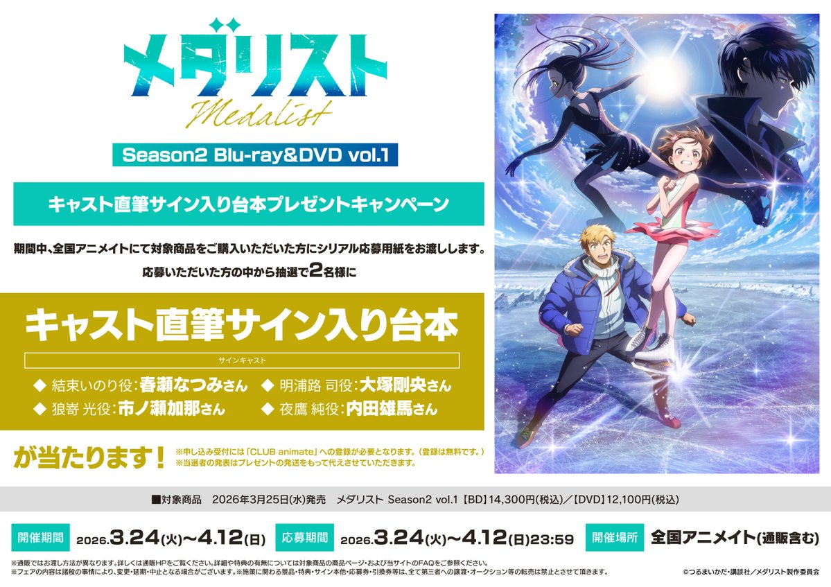 【フェア情報】 3/24(火)より‼️ 『「メダリスト Season2」Blu-ray&DVD vol.1キャスト直筆サイン入り台本プレゼントキャンペーン』開催コォ🎉 期間中、対象商品をご購入頂いた方にシリアル応募用紙をお渡し✨ 抽選で≪直筆サイン入り台本≫をプレゼント🎁 #メダリスト 🔽詳しくはコチラ🔽