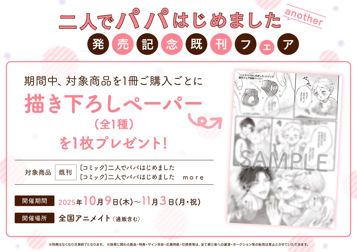 【書籍フェア情報】 本日より 「『二人でパパはじめましたanother』発売記念既刊フェア」 が開催ですコォ❣️ 期間中、対象商品1冊ご購入毎に【描き下ろしペーパー(全1種)】を1枚プレゼント🎁 🔽詳細は下記の画像をチェック🔽