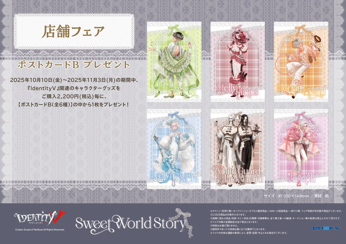 【フェア情報】 Identity V Sweet World Story フェア in アニメイト 明日≪10日~≫開催ですコォ🎉 期間中、フェア条件を満たしたお客様に、≪ポストカードB(全6種)≫を1枚プレゼント🎁✨ #IdentityV #第五人格 🔻詳細はこちら🔻