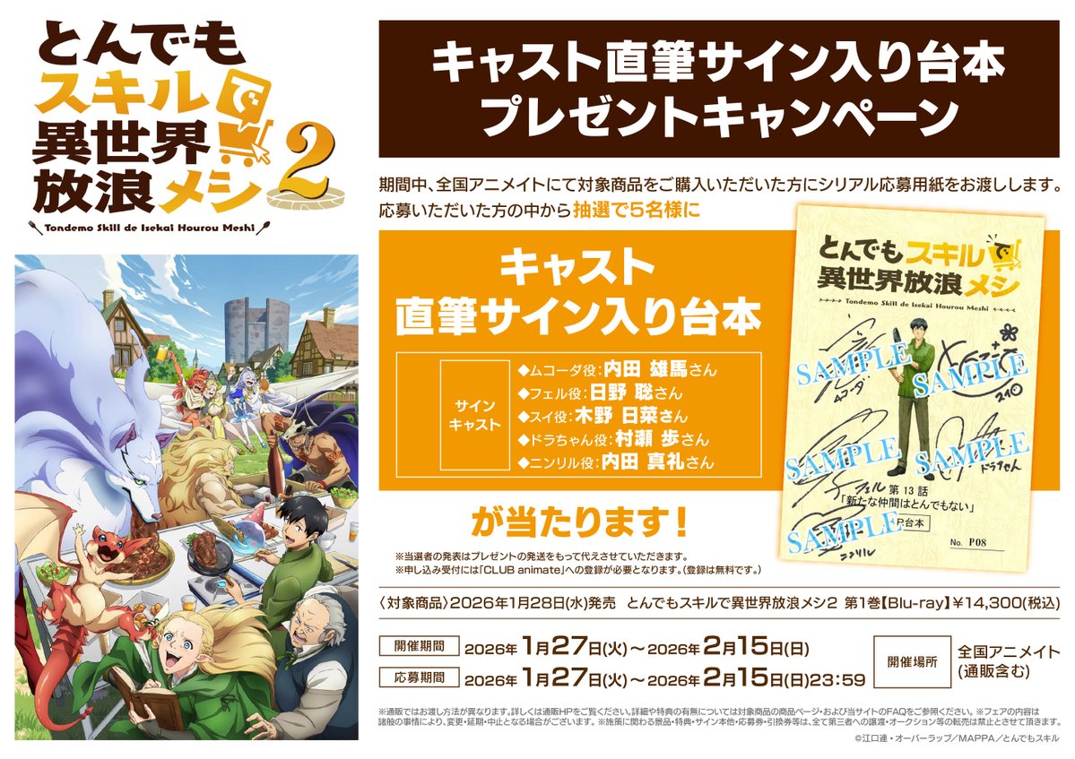 【フェア情報】 「とんでもスキルで異世界放浪メシ2」キャスト直筆サイン入り台本プレゼントキャンペーン 1/27より開催決定コォ‼️‼️ 期間中、全国アニメイトにて対象商品をご購入いただいた方にシリアル応募用紙をお渡ししますコォ✨✨ #とんでもスキル 詳細は🔽POPをチェック
