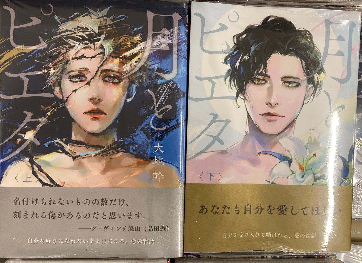 【書籍新刊情報】 「月とピエタ 上・下巻」が入荷しましたコォ🎶 購入特典【リーフレット】がございます #月とピエタ #大地幹 先生 新刊コーナーにて発売中‼️