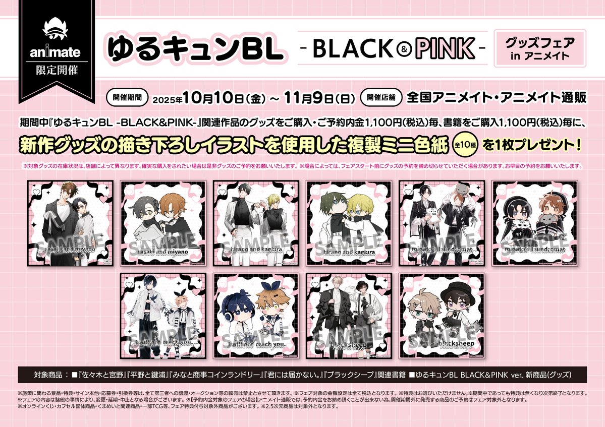 【書籍フェア情報】 10/10(金)より‼️ 『ゆるキュンBL -BLACK&PINK- グッズフェア in アニメイト』開催決定コォ🎉 期間中、関連グッズまたは書籍をご購入で 【ミニ複製色紙(全10種)】を1枚プレゼント🎁 🔽詳しくはコチラ🔽