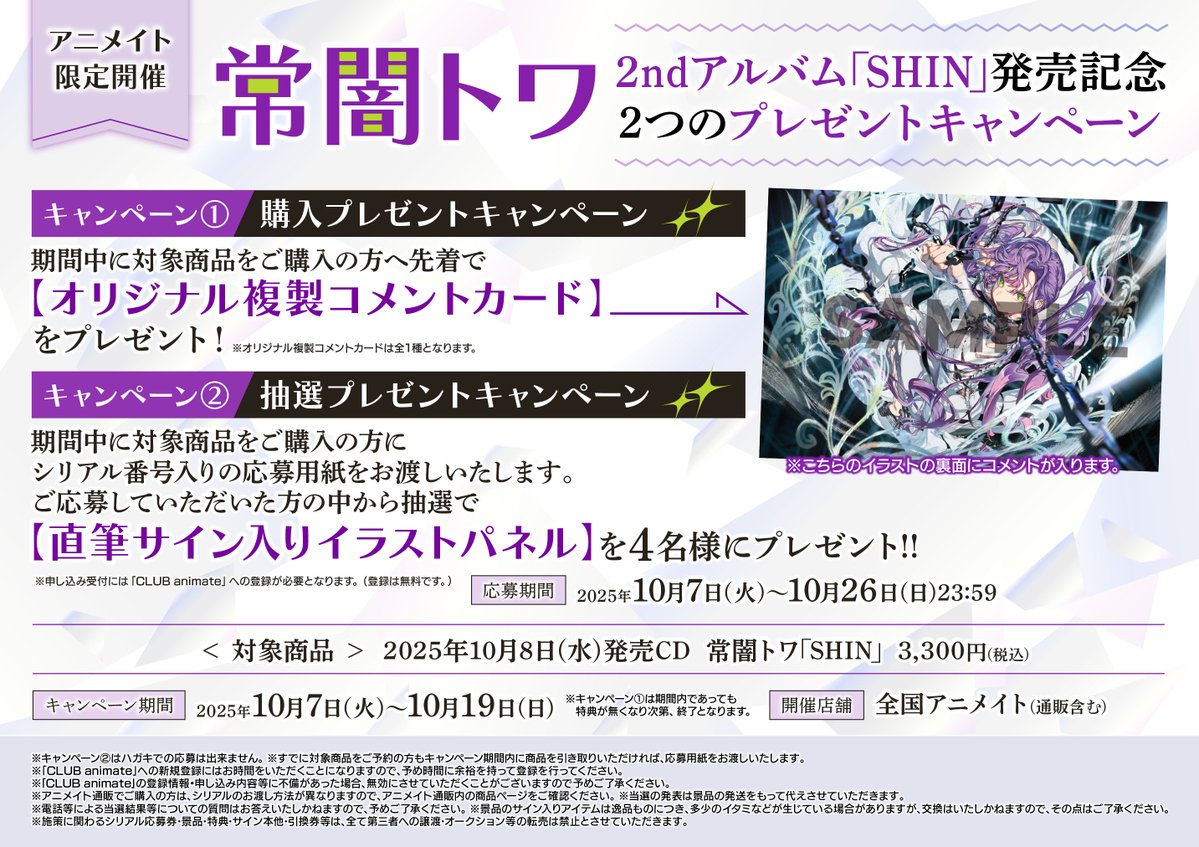 【フェア情報】 10/7(火)より‼️ 『常闇トワ2ndアルバム「SHIN」発売記念 2つのプレゼントキャンペーン』開催決定コォ🎉 期間中に対象商品をご購入で 《オリジナル複製コメントカード》と《シリアル番号入りの応募用紙》をお渡し✨ 🔽詳しくはコチラ🔽