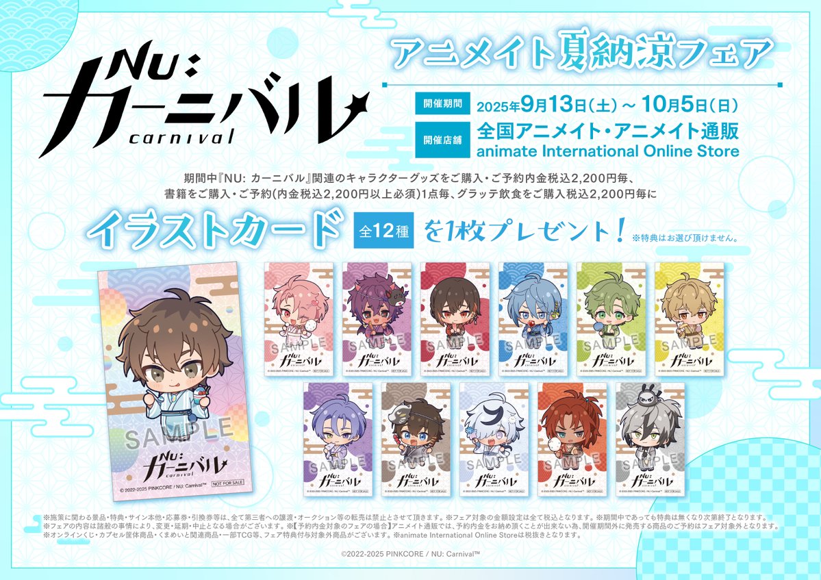 【フェア情報】 ‼フェアは10月5日まで‼ 『NU: カーニバル』アニメイト夏納涼フェア まもなく終了ですコォ 期間中、フェア条件を満たしたお客様に、特典≪イラストカード(全12種)≫を1枚プレゼント🎁✨ 🔻詳細はこちら🔻