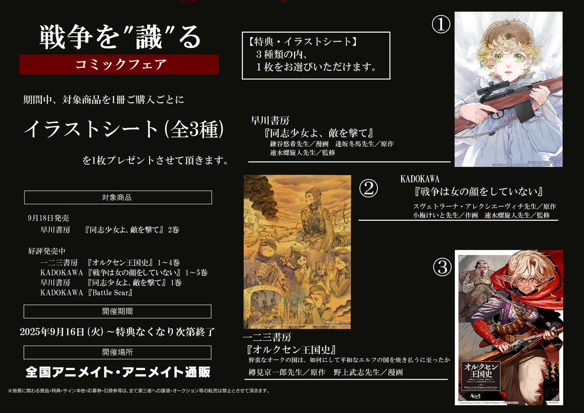 【書籍フェア情報】 『戦争を”識”るコミックフェア』 戦闘ではなく「戦争」を理解できるコミックスを集めてフェアを開催いたします。 特典イラストシートは、話題作から3種をご用意。 詳細は画像をご確認ください。