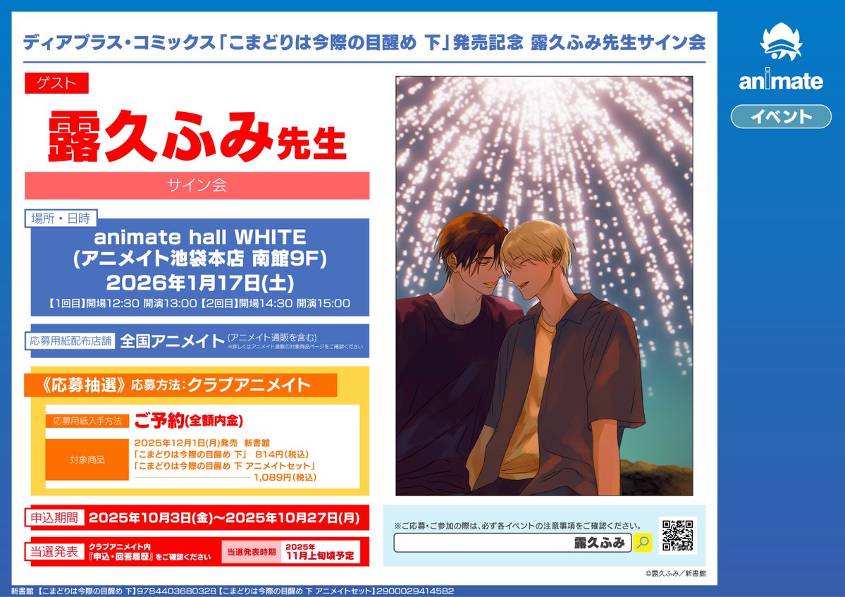 【書籍イベント情報】 『ディアプラス・コミックス「こまどりは今際の目醒め 下」発売記念 露久ふみ先生サイン会』 の開催が決定ですコォ💕 #こまどりは今際の目醒め #露久ふみ 先生 🔽詳細は下記の画像をチェック🔽