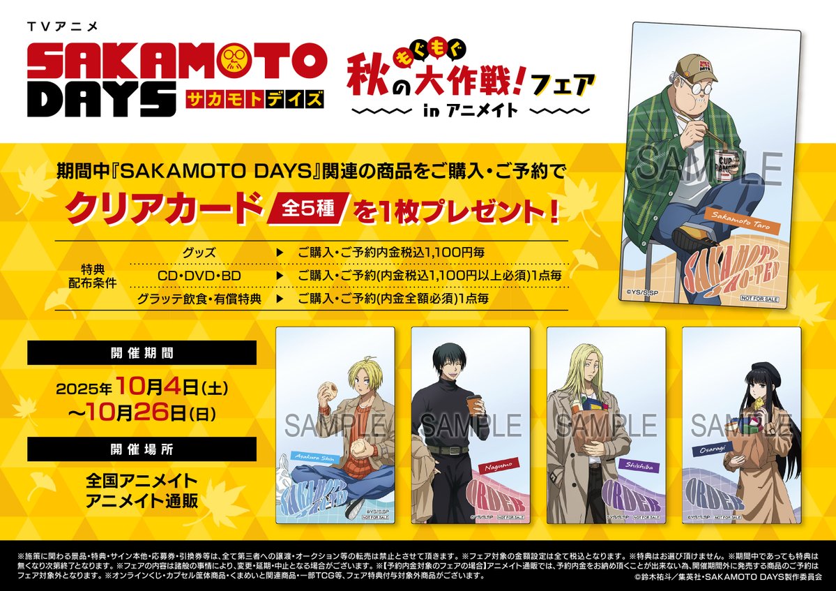 【フェア情報】 TVアニメ「SAKAMOTO DAYS」秋のもぐもぐ大作戦!フェア in アニメイト 明日≪4日~≫開催ですコォ🎉 期間中、フェア条件を満たしたお客様に、≪クリアカード(全5種)≫を1枚プレゼント🎁✨ 🔻詳細はこちら🔻