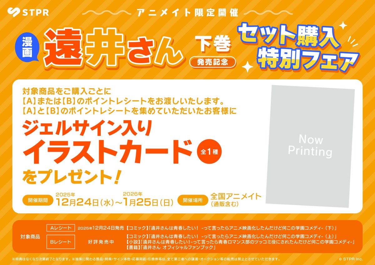 【書籍フェア情報】 『漫画 遠井さん下巻発売記念 セット購入特別フェア』 開催決定コォ🎶 期間中、対象商品をご購入ごとに【A】または【B】のレシートをお渡し🌟 【A】と【B】のレシートを集めていただいたお客様に【ジェルサイン入りイラストカード(全1種)】をプレゼント🎁 🔽詳細はこちら🔽