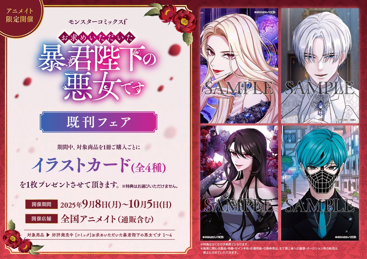 【書籍フェア情報】 『モンスターコミックスf「お求めいただいた暴君陛下の悪女です」既刊フェア』 まもなく終了ですコォ❗️ 期間中、対象商品を1冊ご購入ごとにイラストカード(全4種)を1枚プレゼント🎁 #お求めいただいた暴君陛下の悪女です 🔽詳細はPOPをチェック🔽
