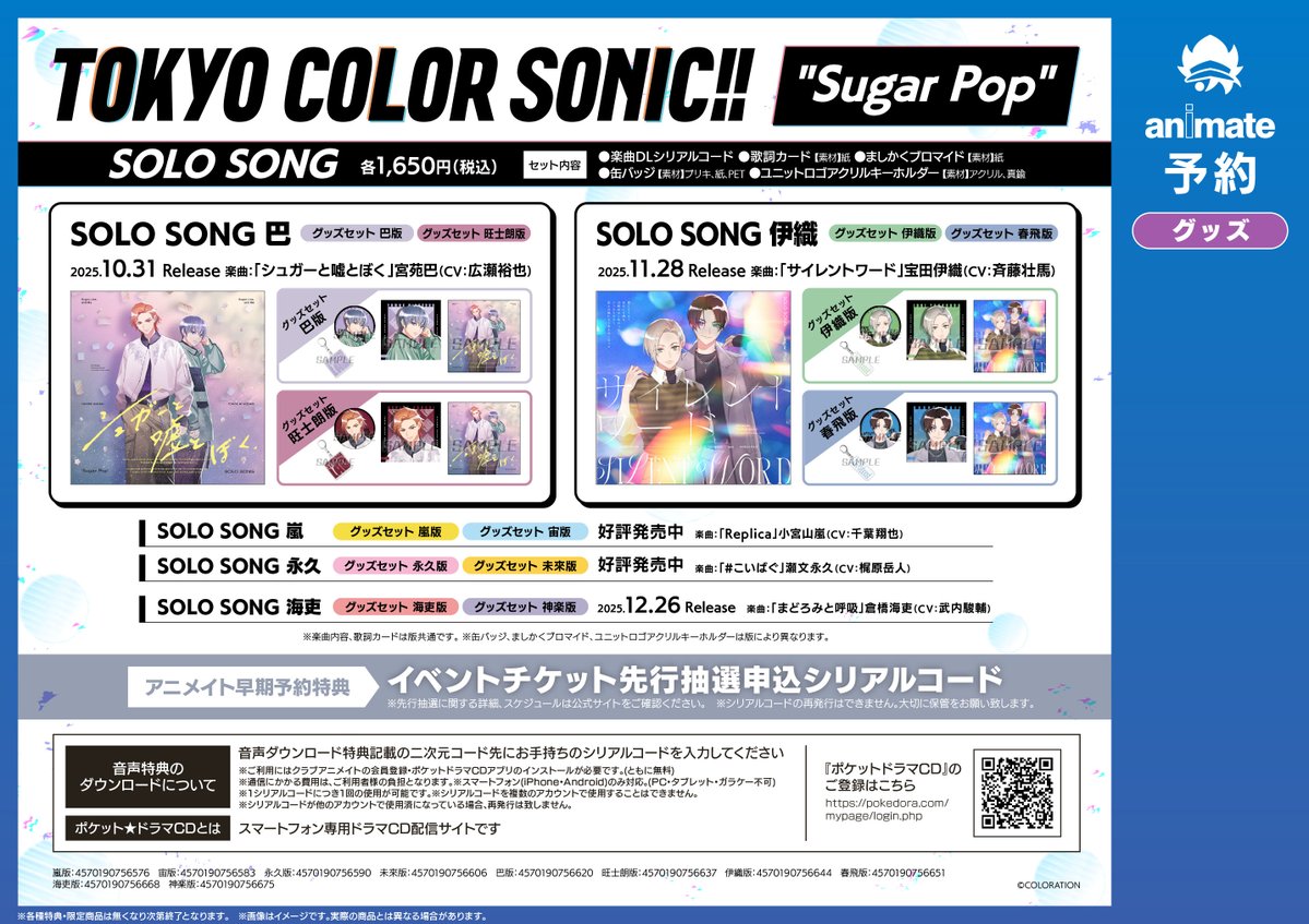 【グッズ予約情報】 東京カラーソニック!! “Sugar Pop” SOLO SONG 巴 【グッズセット巴版】・【グッズセット旺士朗版】 各種予約受付中コォ✨✨ 📢早期予約キャンペーンは9/30まで‼️‼️ 全額内金ご予約でイベントシリアルコードをお渡しコォ✨ ⬇️バーコード提示で簡単予約