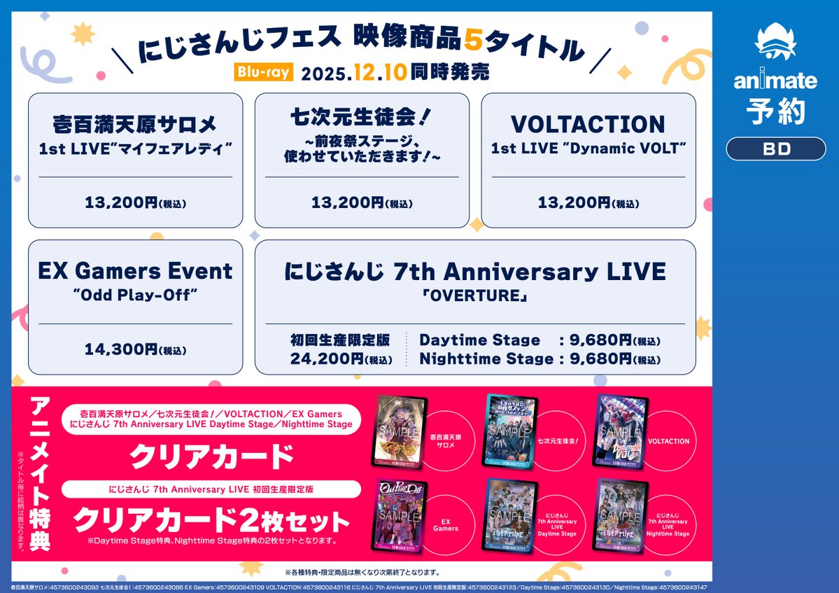 【BD予約情報】 にじさんじフェス 映像商品5タイトル 各種予約受付中コォ🌈✨ 🎁各アニメイト特典:クリアカード #にじさんじ 🔽バーコード提示で簡単予約