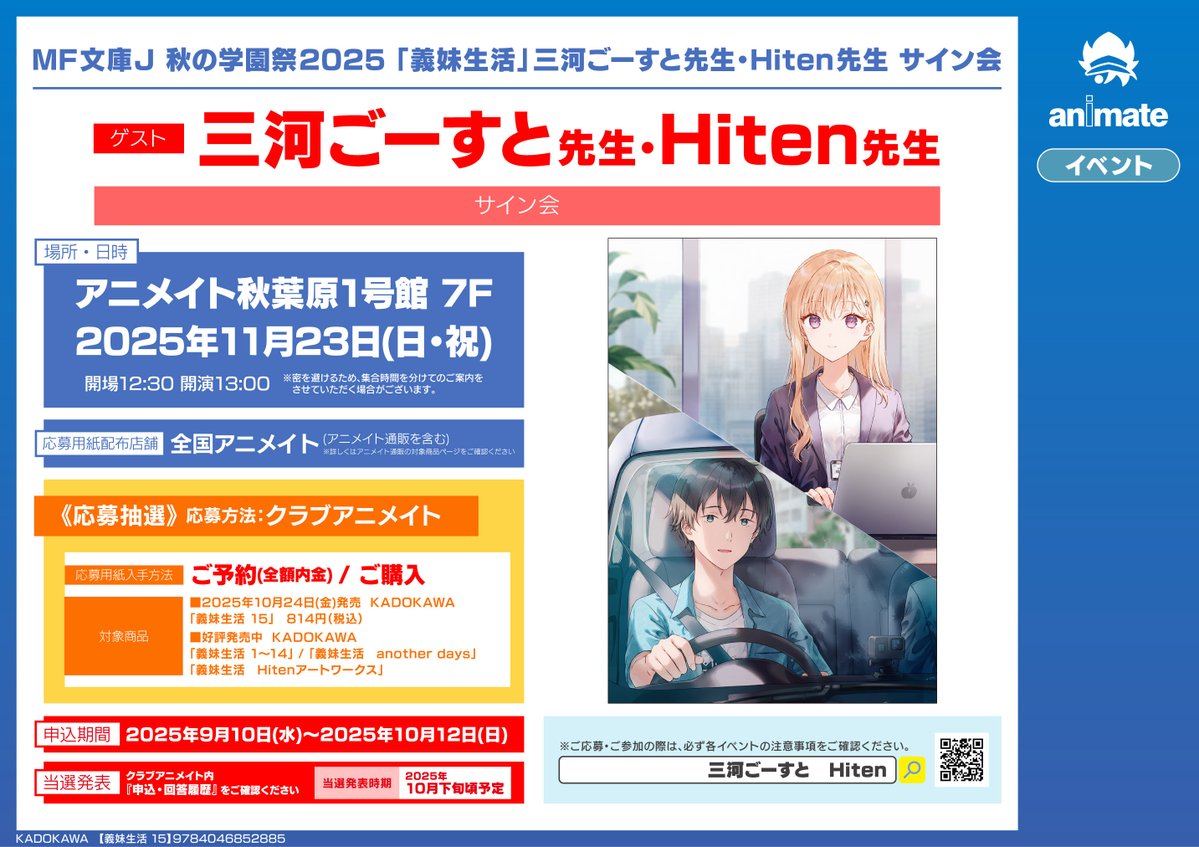 【イベント情報】 『MF文庫J 秋の学園祭2025 「#義妹生活」三河ごーすと先生・Hiten先生 サイン会』開催決定コォ🎉 期間中、対象書籍をご予約(全額内金)またはご購入いただいた方に《応募シリアルレシート》をお渡し🎁 #三河ごーすと 先生 #Hiten 先生 #MF秋の学園祭 🔽詳しくはコチラ🔽