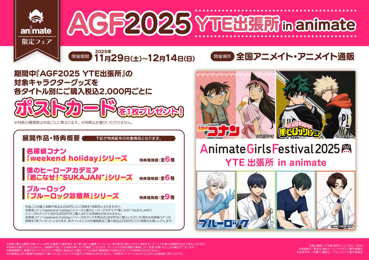 【AGF2025 YTE出張所 in animate】開催決定! 全国のアニメイトにて11/29よりスタート! #名探偵コナン #僕のヒーローアカデミア #ブルーロック 3コンテンツの描きおろし新商品がラインナップ! 本日より予約開始! 通販はこちら