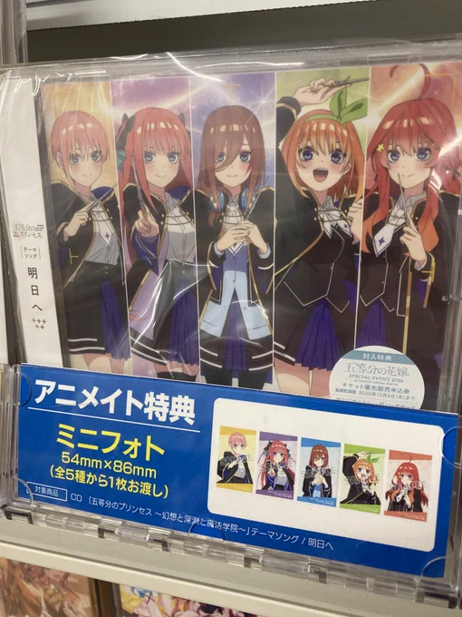 【CD入荷情報】 ゲーム 五等分のプリンセス ~幻想と深淵と魔法学院~ テーマソング「明日へ」 入荷コォ🪄 🎁アニメイト特典:ミニフォト(全5種から1枚お渡し) 🎁封入特典:『五等分の花嫁 SPECIAL EVENT 2026 in TOYOTA ARENA TOKYO』チケット優先販売申込券 #五等分の花嫁 #五等分のプリンセス