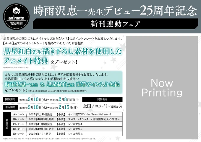 【書籍フェア情報】 9月10日より 『「時雨沢恵一先生デビュー25周年記念新刊連動フェア」』 の開催が決定ですコォ✨ 🔽詳細は下記の画像をチェック🔽