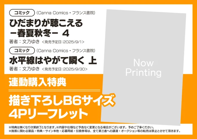【書籍特典情報】 フランス書院 『ひだまりが聴こえる-春夏秋冬- 4&水平線はやがて瞬く 上)』 連動購入特典 期間中、対象商品をご購入のお客様に【描き下ろしB6サイズ4Pリーフレット】をプレゼント🎁 🔽詳細は下記の画像をチェック🔽