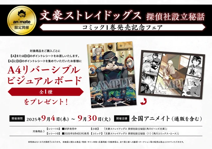 【書籍フェア情報】 『「文豪ストレイドッグス 探偵社設立秘話」コミック1巻発売記念フェア』が開催中コォ🎉 対象書籍をご購入ごとにポイントレシートをお渡し✨ ポイントレシートを集めていただくと 『A4リバーシブルビジュアルボード』をプレセント🎁 #文豪ストレイドッグス 🔽詳しくはコチラ🔽