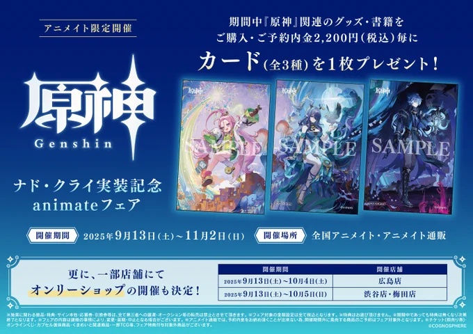【フェア情報】 9/13(土)より‼️ 「『原神』 ナド・クライ実装記念 animateフェア」開催決定コォ🎉 期間中、関連のグッズ・書籍をご購入・ご予約内金2,200円毎に《カード(全3種)》を1枚プレゼント🎁✨ #原神 🔽詳しくはコチラ🔽 animate-onlineshop.jp/conten…