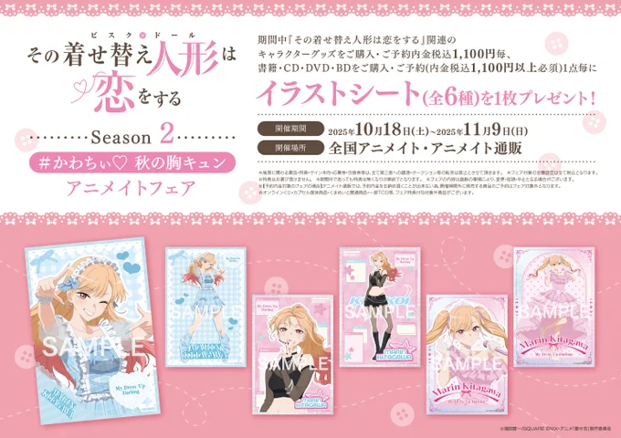 【フェア情報】 🎊10月18日より開催決定ですコォ🎊 「TVアニメ『その着せ替え人形は恋をする』Season 2#かわちぃ♡ 秋の胸キュン アニメイトフェア」 期間中、フェア条件を満たしたお客様に、特典「イラストシート(全6種)」をプレゼント🎁#着せ恋 #着せ恋アニメ 🔽詳細はこちら🔽