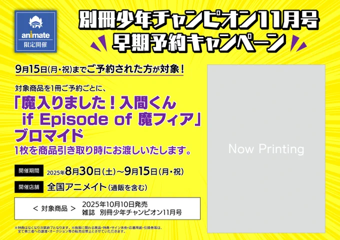 【書籍キャンペーン情報】 『別冊少年チャンピオン 11 月号早期予約キャンペーン』 開催コォ🎉 期間中に対象商品をご予約いただいたお客様に 【早期予約特典としてブロマイド】をお渡し🎁 ※特典は商品引き取り時のお渡しとなります。