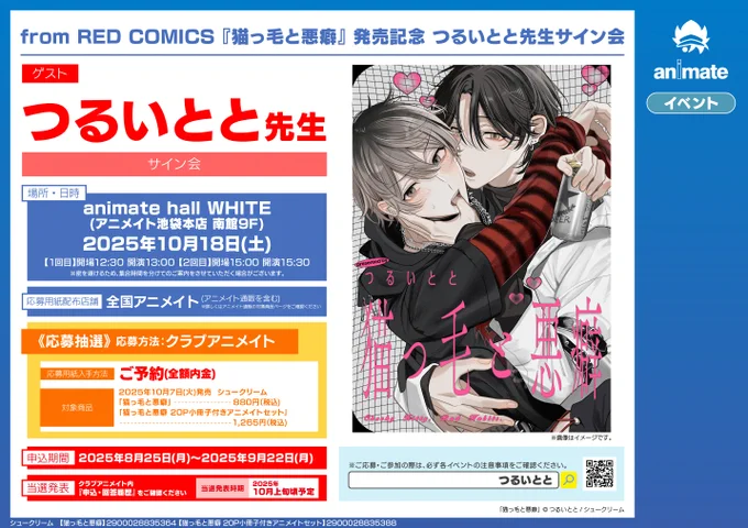【書籍イベント情報】 「from RED COMICS 『猫っ毛と悪癖』 発売記念 つるいとと先生サイン会」 の開催が決定ですコォ❣️ #猫っ毛と悪癖 #つるいとと 先生 🔽詳細は下記の画像をチェック🔽