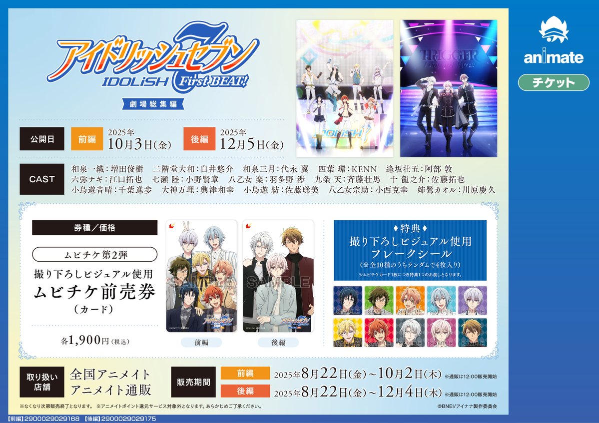 『アイドリッシュセブン First BEAT! 劇場総集編』 前編:10/3 後編:12/5 公開 ムビチケ第2弾は、【前編】IDOLiSH7【後編】TRIGGER の撮り下ろしビジュアルを使用✨ 特典は「撮り下ろしビジュアル使用フレークシール」です☆ ただいま大好評販売中コォ! #アニナナ総集編