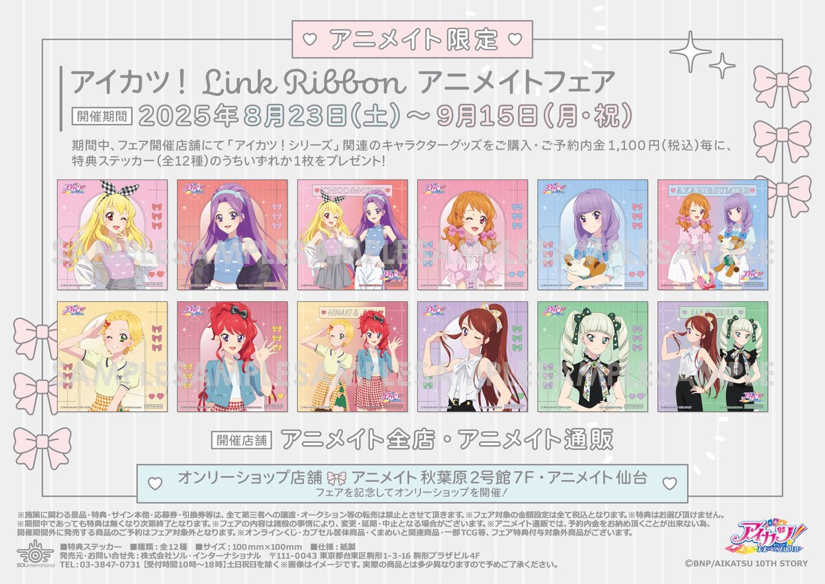 【フェア情報】 アイカツ! Link Ribbon アニメイトフェア 本日≪23日~≫開催ですコォ🎉 期間中、フェア条件を満たしたお客様に、≪特典ステッカー(全12種)≫を1枚プレゼント🎁✨ #aikatsu 🔻詳細はこちら🔻 animate-onlineshop.jp/contents/fair_…