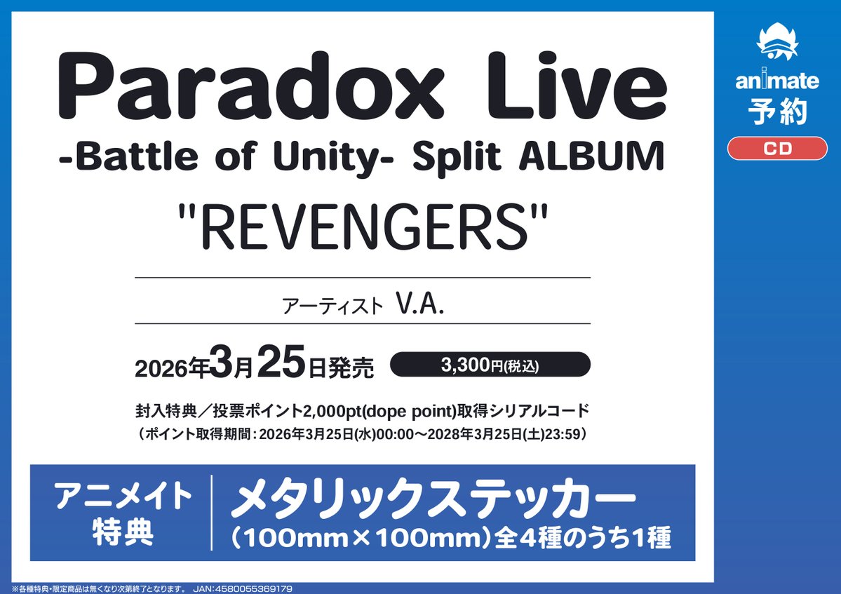 【CD予約情報】 Paradox Live -Battle of Unity- Split ALBUM “REVENGERS” 予約受付中コォ✨✨ 🎁アニメイト特典:メタリックステッカー 全4種のうち1種 🎁封入特典:投票ポイント2,000pt(dope point)取得シリアルコード #パラライ ⏬バーコード提示で簡単予約