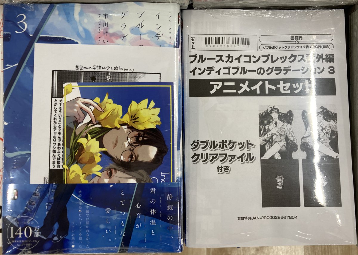 【書籍新刊情報】 「ブルースカイコンプレックス番外編 インディゴブルーのグラデーション」3巻 が入荷しましたコォ🎵 アニメイトセット【描き下ろしダブルポケットクリアファイル付き】がございますコォ🌟 新刊コーナーにて発売中ですコォ❗️ #市川けい 先生