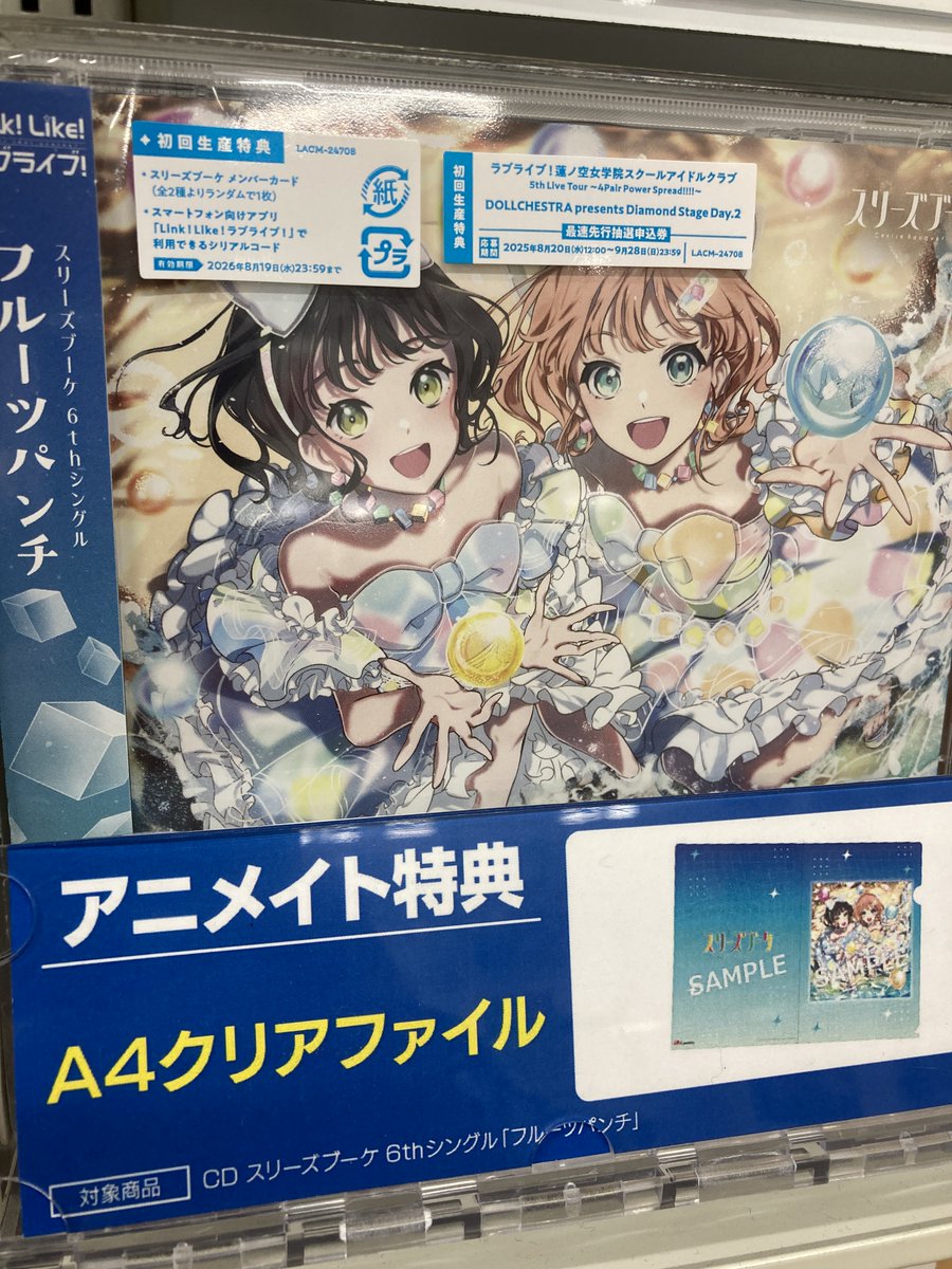 【CD入荷情報】 ラブライブ! 蓮ノ空女学院スクールアイドルクラブ スリーズブーケ 6thシングル「フルーツパンチ」 入荷しましたコォ🎵🎵 🎁アニメイト特典:A4クリアファイル 🎁封入特典:DOLLCHESTRA presents Diamond Stage Day.2 最速先行抽選申込券 #lovelive #蓮ノ空