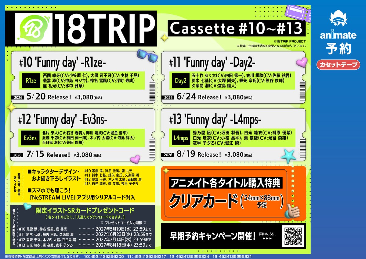 【カセットテープ予約情報】 18TRIP Cassette #10~#13 ‘Funny day’ 各タイトル予約受付中コォ🎵🎵 8/21までの期間中、いずれかに全額内金ご予約で 『“おもてなしライブ” -Sparkle-』の応募用シリアルナンバーをお渡しコォ‼️‼️ #エイトリ 🔽バーコード提示で簡単予約 animate-onlineshop.jp/pd/3164963/?ut…