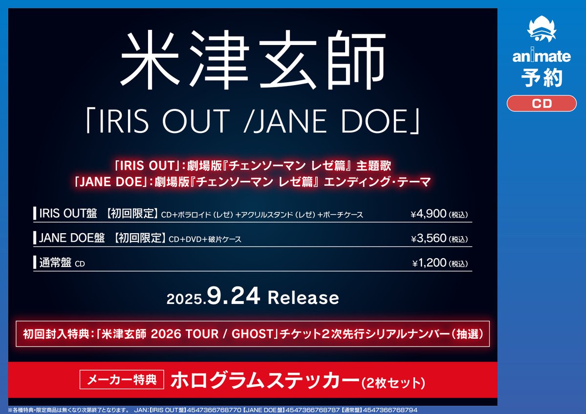 【CD予約情報】 劇場版『#チェンソーマン レゼ篇』 主題歌/エンディング・テーマ #米津玄師 さん「IRIS OUT / JANE DOE」 予約受付中コォ‼️‼️ 🎁封入特典🎁 「米津玄師 2026 TOUR / GHOST」チケット2次先行シリアルナンバー(抽選) 🔽バーコード提示で簡単予約 animate-onlineshop.jp/pd/3188432/?ut…