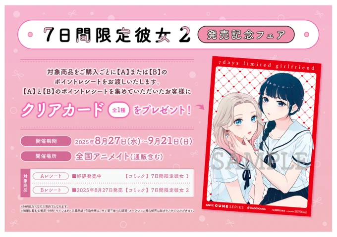 【書籍フェア情報】 8月27日より 『「7日間限定彼女 2」発売記念フェア』 の開催が決定ですコォ☀️ #7日間限定彼女 🔽詳細は下記の画像をチェック🔽