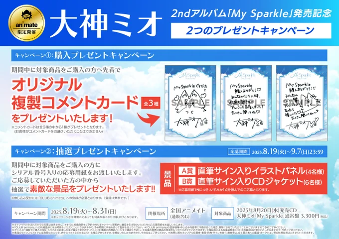 【フェア情報】 大神ミオ2ndアルバム「My Sparkle」発売記念 2つのプレゼントキャンペーン 8/19(火)より開催決定コォ‼️‼️ 期間中、対象商品をご購入で 『オリジナル複製コメントカード』と『シリアル番号入りの応募用紙』をプレゼントいたしますコォ✨✨ #大神ミオ さん 詳細は🔽POPをチェック