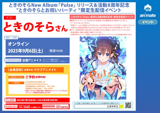 【イベント情報】 📣8/18まで‼️‼️ ときのそらNew Album「Pulse」リリース&活動8周年記念”ときのそらとお祝いパーティ”限定生配信イベント 対象商品に全額予約内金でご予約いただいたお客様に応募シリアルをお渡しコォ✨✨ ※シリアル希望の場合、早期特典は対象外となります 詳細は🔽POPをチェック