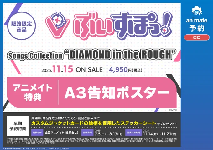 【CD予約情報】 ぶいすぽっ!Songs Collection “DIAMOND in the ROUGH” 予約受付中コォ🎶🎶 🎁早期予約特典:カスタムジャケットカードの絵柄を使用したステッカーシート ※8/17(日)までにご予約いただいたお客様が対象となります 🔽バーコード提示で簡単予約