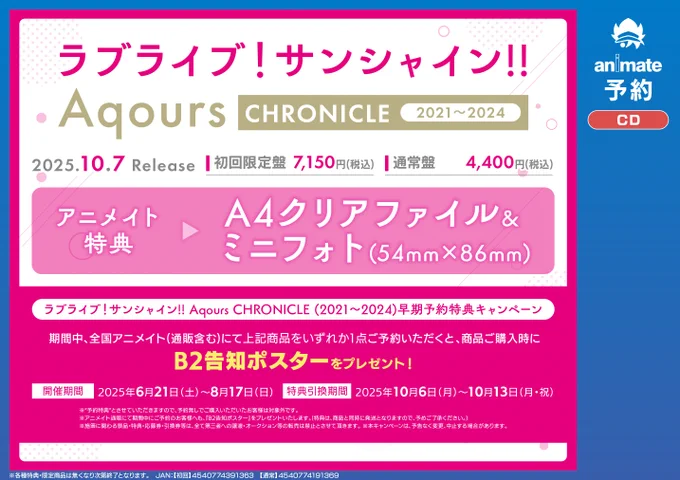 【CD予約情報】 ラブライブ!サンシャイン!! Aqours CHRONICLE (2021~2024) 予約受付中コォ✨✨ 📣早期予約キャンペーンは8/17(日)まで‼️‼️ 🎁早期予約特典:B2告知ポスター#Aqours 🔽バーコード提示で簡単予約